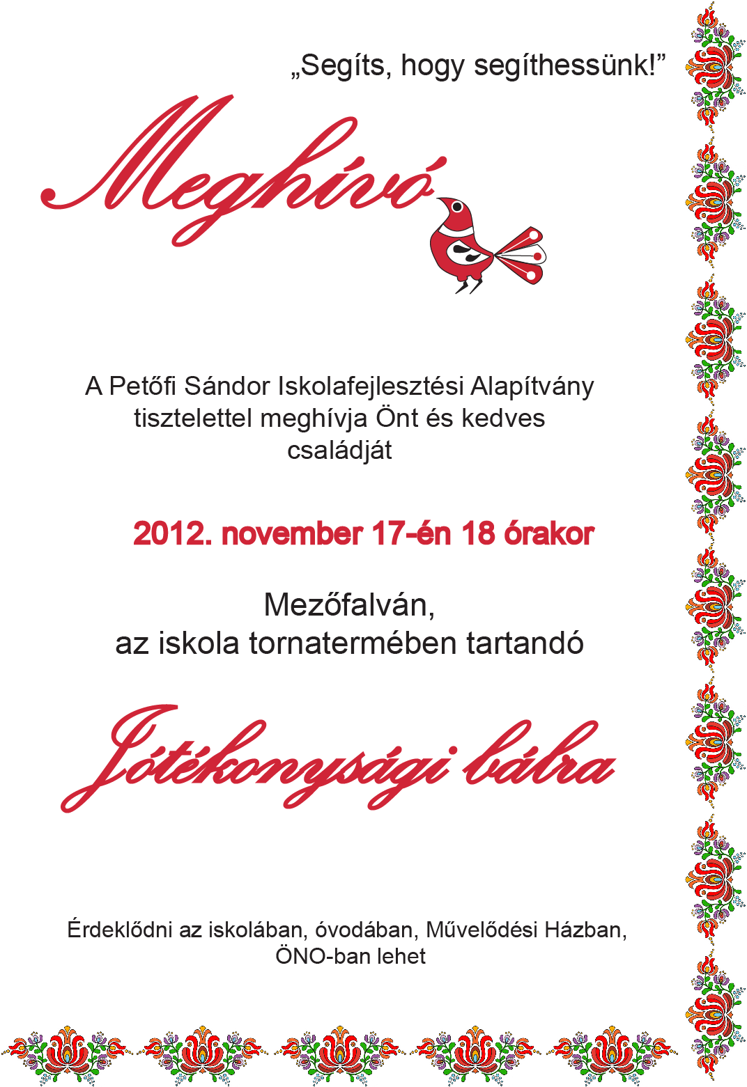 2012. november 17-én 18 órakor, Mezőfalván - az iskola tornatermében. További részletekért kattintson ide |
